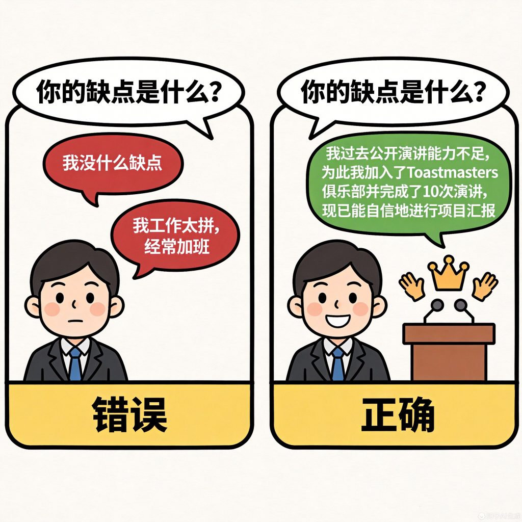 3. 处理“你的缺点是什么?” 不要耍小聪明(如“我工作太拼命”)。诚实地讲一个真实的、非核心的缺点,并重点说明你正在采取什么具体措施改进它。这体现自我认知和成长型思维。