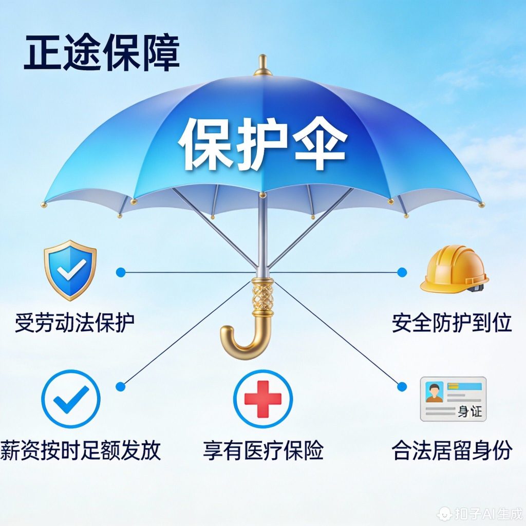 与打黑工的无尽黑暗相比,合法工作签证为海外劳动者构建了一个权益受保护、未来有前景的光明世界。其核心在于:合法性、合同保障和权益网络。