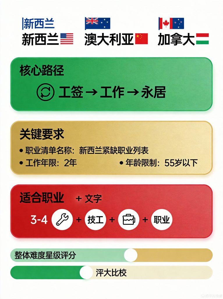 | 新西兰 | 绿色清单通道、技术移民类别 | 绿色清单提供直通或工作2年后转永居的确定性路径;技术移民采用6分制。 | 医生、工程师、电工、幼教、机械师 |
