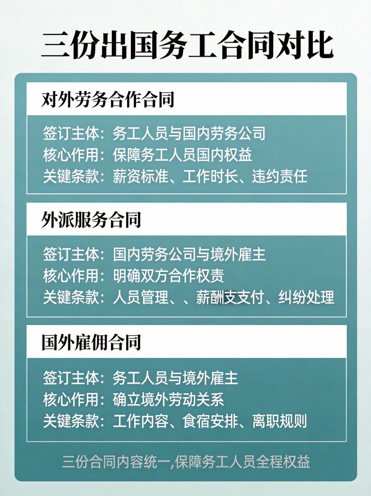 根据规定,一个完整的、受保护的外派流程,需要签订三份核心合同,它们环环相扣,内容必须一致: