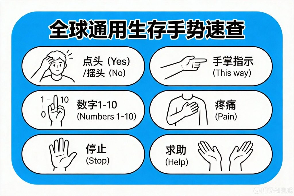 | 表达数字 | 尽量用双手比划(1-10全球通用手势)。价格等重要数字,写在纸上或手机计算器上确认。 | 依赖复杂手势,容易误解。 |