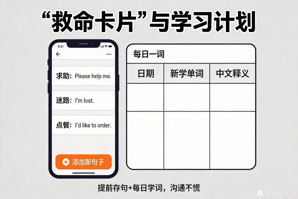 - 提前准备“救命卡片”:在手机备忘录或用翻译APP提前准备好几张“数字卡片”,存好以下句子的翻译: