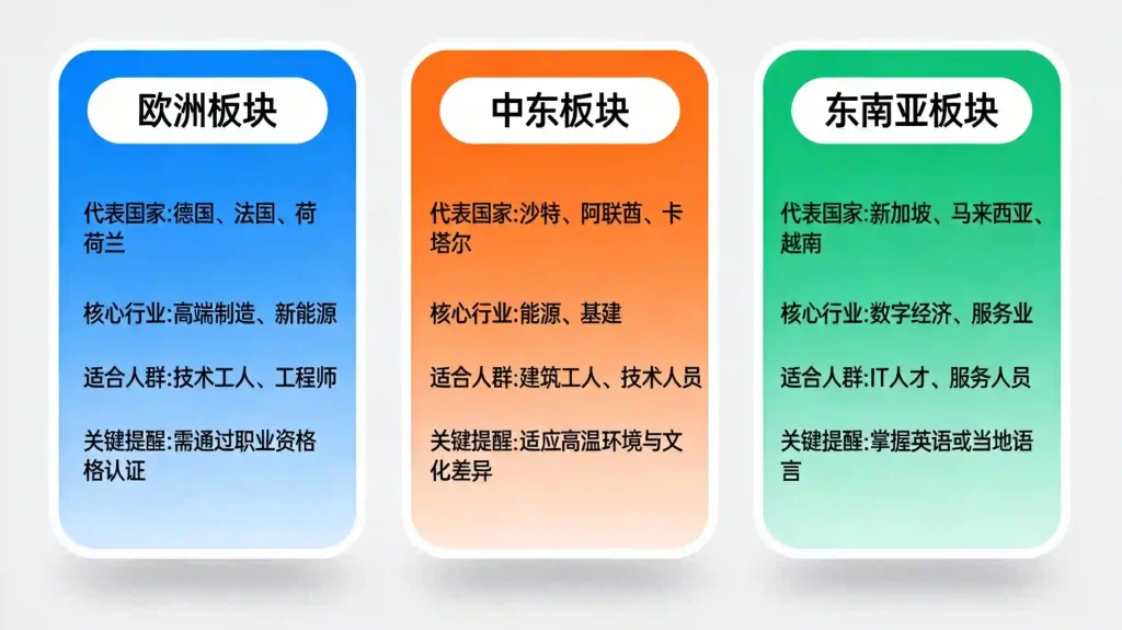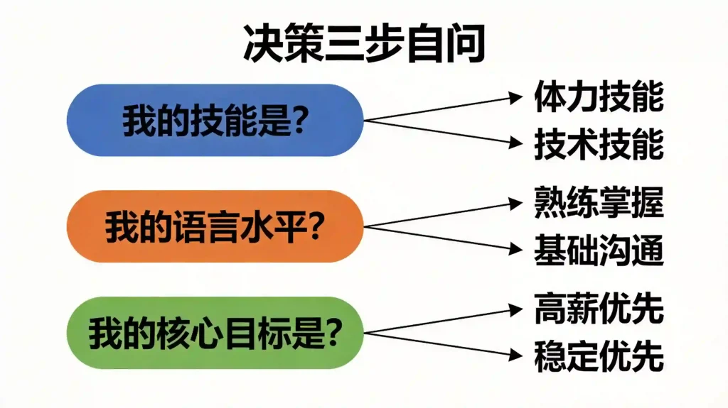 | 我有什么“硬技能”或证书? | 有硬核技术证书(电工、焊工、护士)→ 重点考虑板块一(欧美澳新)。有项目经验 → 关注板块二(新兴市场项目)。有数字技能或年轻想体验 → 研究板块三(数字游民/打工度假)。 |
