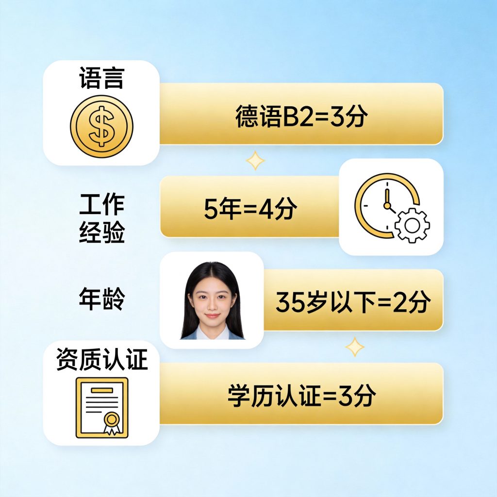 • 语言是隐形加分项:虽然入门只需A1德语或B2英语,但更高的语言水平(尤其是德语)能带来显著的积分优势,并极大提升你在德国的求职成功率。
