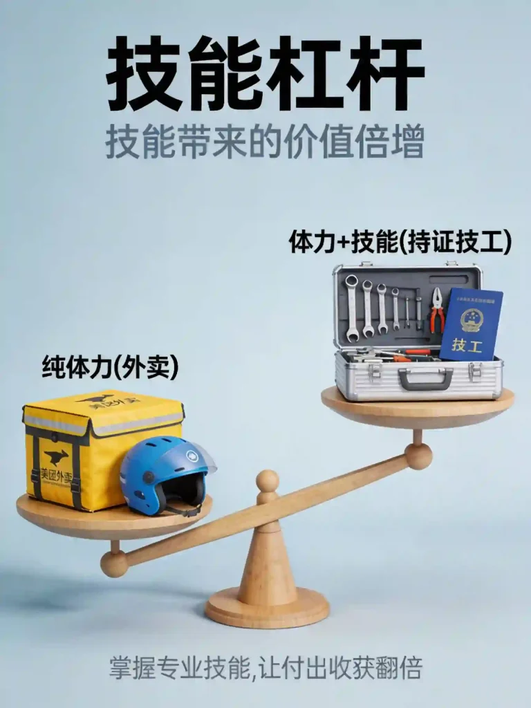 第二步,寻找“技能杠杆”:送外卖是纯体力杠杆。想获得更高回报,你需要一个“技能杠杆”。这可以是: